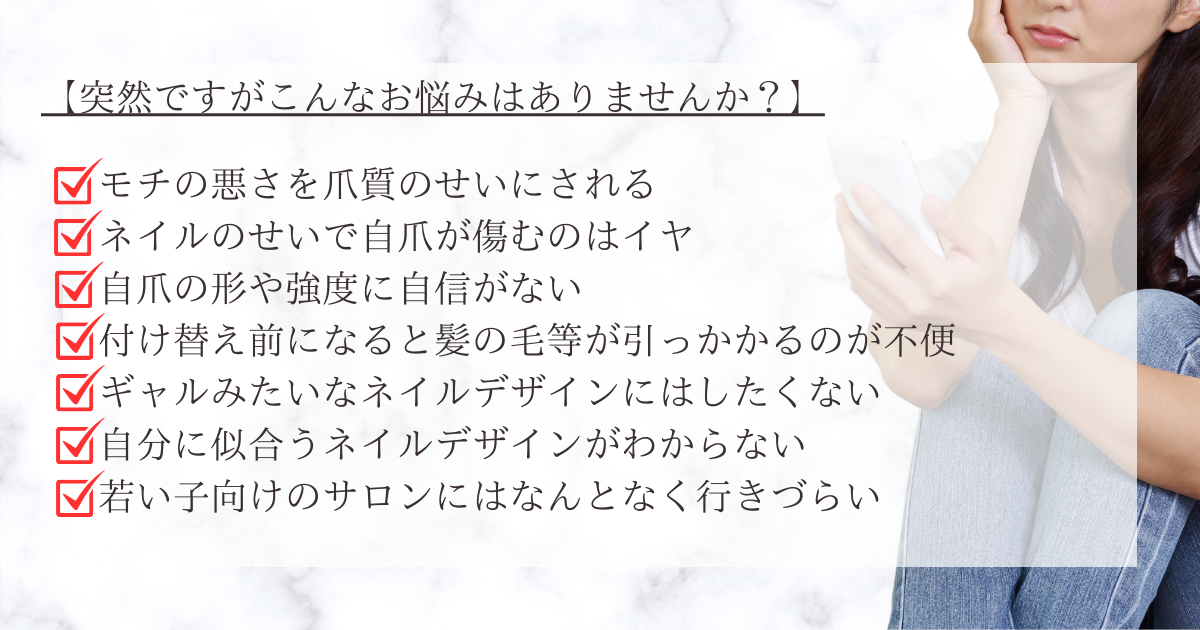 どこのサロンに行ってもイマイチ満足できなかった人や、深爪・反り爪・わし爪などお爪にコンプレックスのある人、4週間キレイにネイルが保てない人まで!絶対ご満足いただけます!
